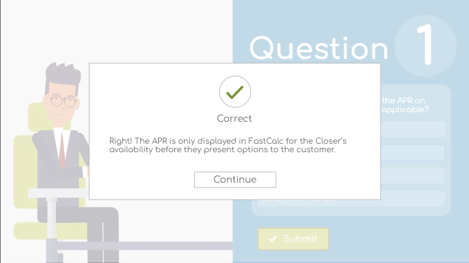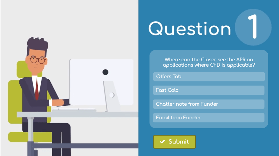 Design: This informative, fast-paced course was meant to deliver new information about changes in the lending industry without a lot of fluff. We kept it simple by using on screen text instead of voice over narration.