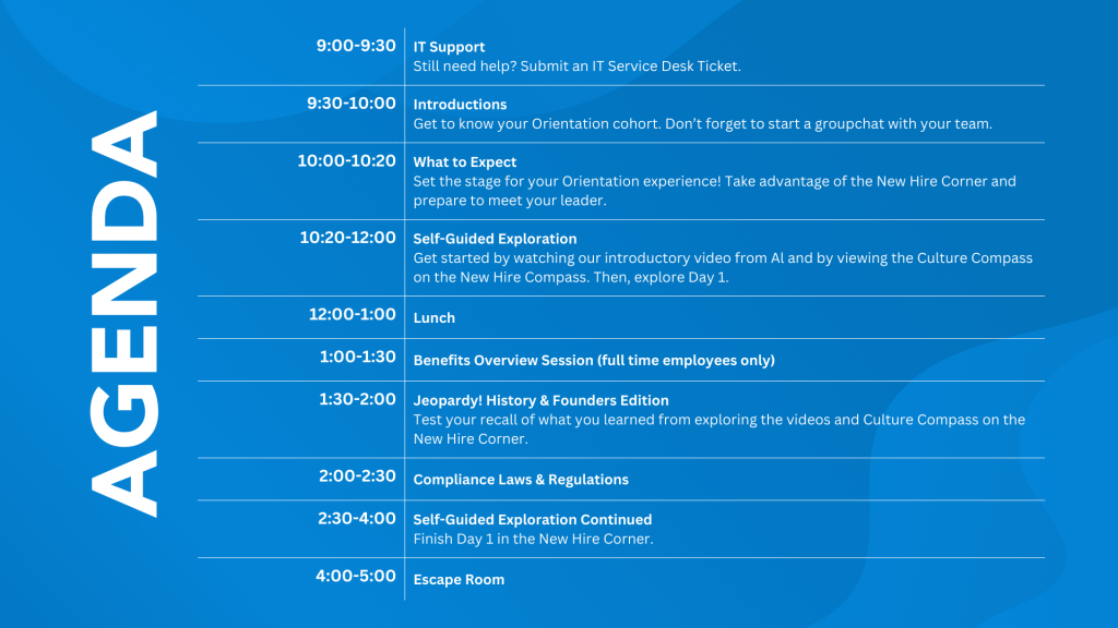Group activities: This experience emphasizes the importance of relationship building early on in an employee’s tenure. Early in the day, ice-breakers are done in small groups to take the pressure off. These groups will be continued throughout the day for additional activities including Jeopardy and a virtual escape room, both of which offer prizes for the winning teams.