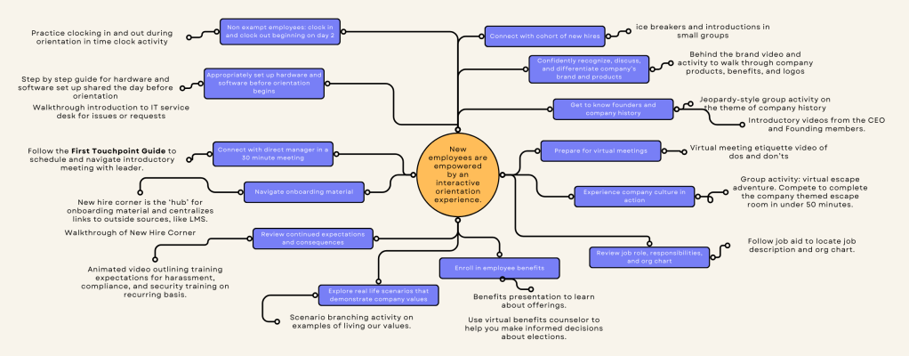After defining the performance objectives, developing visual mockups, and meeting with peer designers, we collaborated to complete 25 stories over the course of 6 sprints to complete the full transformation of orientation. Development included Articulate Storyline and Rise, Powerpoint for VILT, Vyond Animation, Canva, and Confluence.